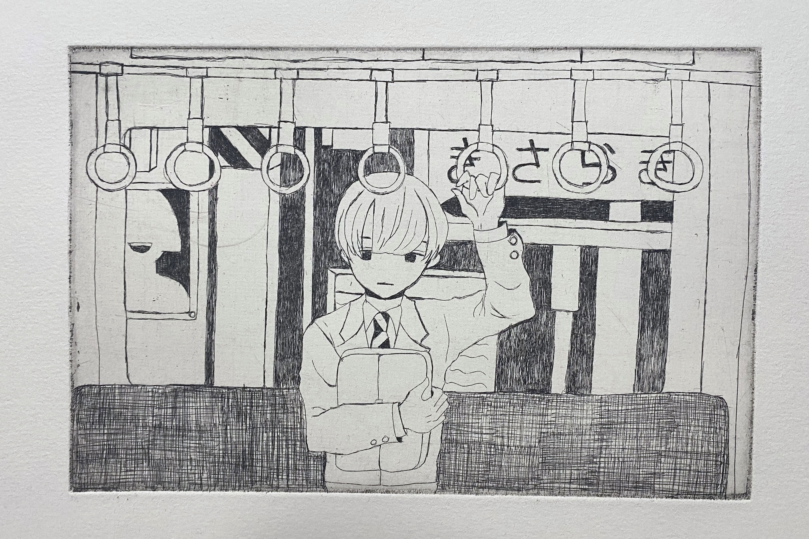 結構有名な怖い無人駅・きさらぎ駅と自分で考えた不治の病の男の子の元に天使が迎えに来たというお話を版画に表した作品。