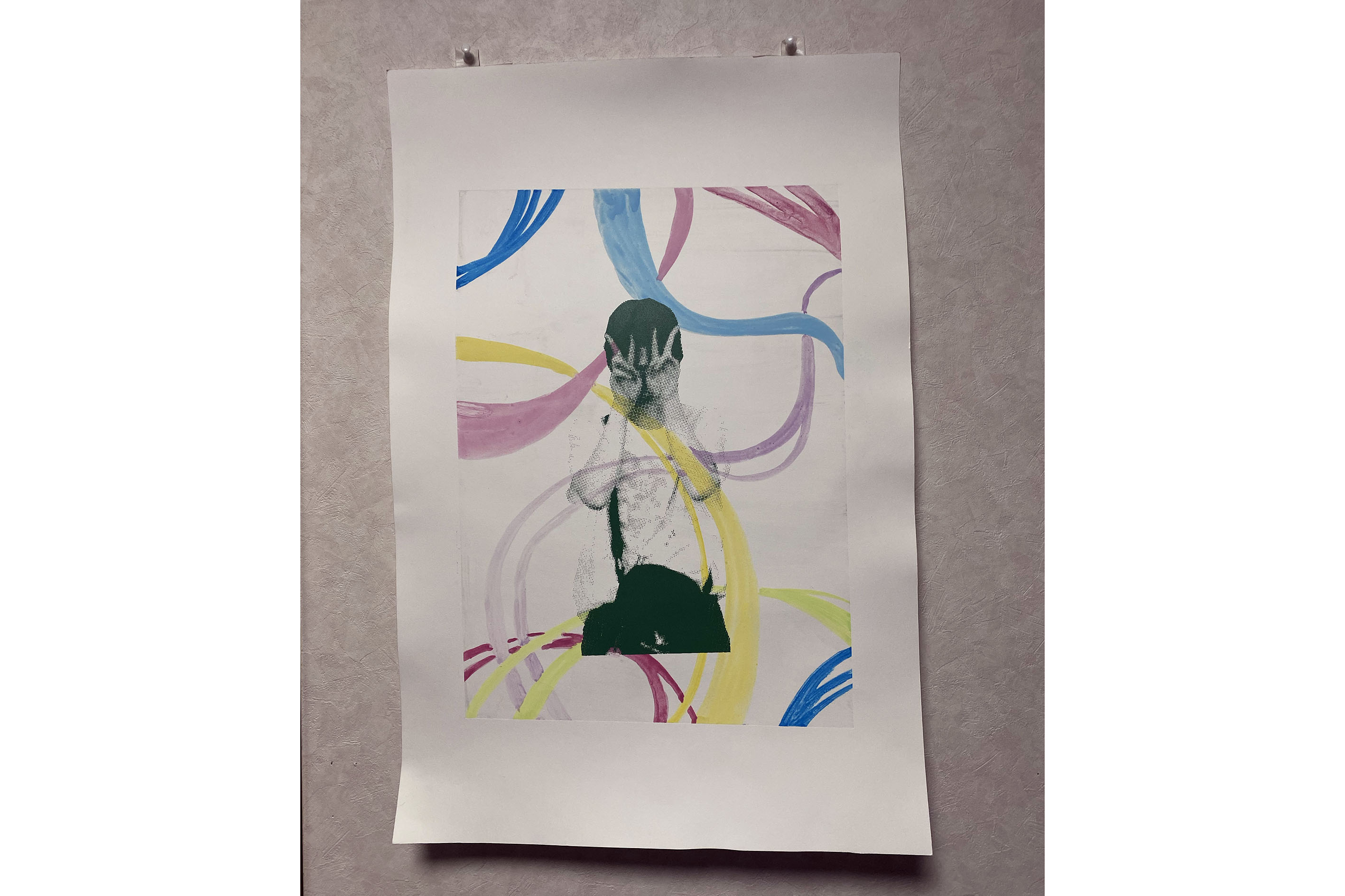 自分の画像と平面的な要素のイラストを重ねて制作した作品。